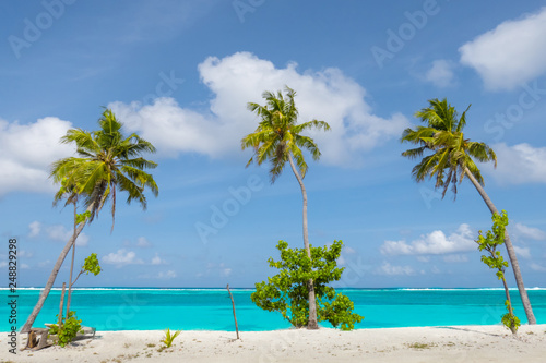 Naklejka premium Palm tree on tropical paradise beach with turquoise blue water and blue sky