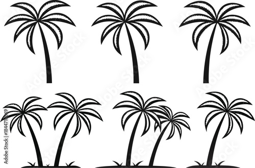 Fototapeta premium Palm Tree Set in Clean Outline Strokes. Minimal Palm Tree Illustration with Line Art Style. Tropical Palm Tree Design in Outline Style. Coastal Palm Tree Collection with Thin Line Art. Natural Palm
