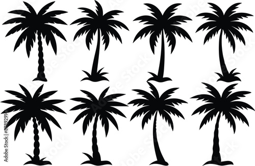 © Trendy CraftSVG , Obraz premium Palm tree Silhouette Set, set of black silhouettes of a palm tree, silhouette of a palm tree isolated