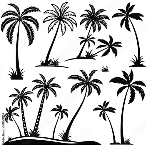 Fototapeta premium Palm Tree Silhouette Vector Set – Tropical Island Tree Illustrations with Grass and Curved Trunks, Ideal for Beach, Summer, Jungle, Paradise, or Exotic Nature Design Projects