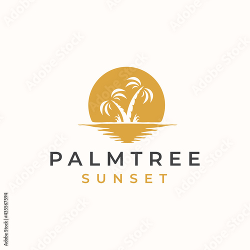 © Guna Studio, Obraz premium Palm Tree with Sunset background Logo Template. Vector Illustration