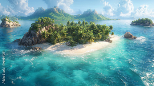 Fototapeta premium Palm trees and driftwood scattered along the edge of a beach, waves rolling...