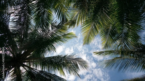 Fototapeta premium Palm trees canopy outdoor sky view