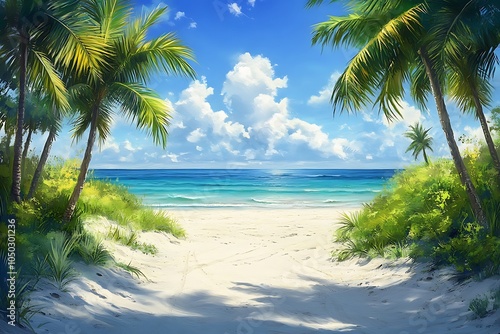 Obraz premium Palm Trees Frame Sandy Path to Tranquil Beach