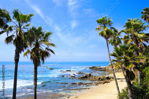 © Jenifoto, Fototapeta premium Palm trees framing the sandy shores of the blue Pacific Ocean. Laguna Beach, California, USA.