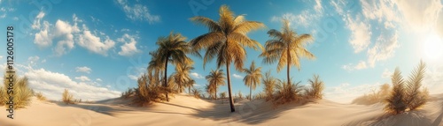 © Rere_Art151, Fototapeta premium Palm Trees Grace a Sandy Desert Oasis Under a Blue Sky