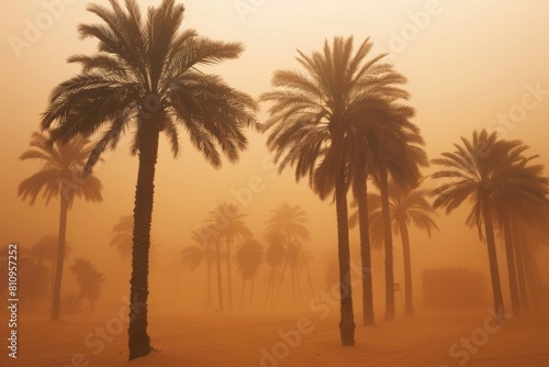 Naklejka premium palm trees in the desert or beach during sandstorm or dust storm. Environment...