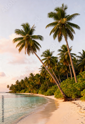 © Wang, Obraz premium Palm trees lean over a sandy beach at sunset.