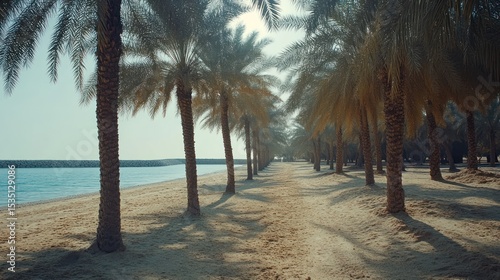 © minang, Obraz premium Palm trees line a beach path.