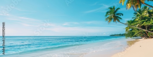 Fototapeta premium palm trees line the shore, clear blue ocean stretches out, boat distant on...
