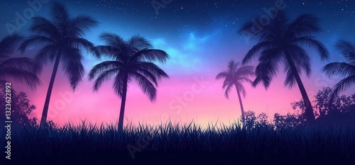 © Boke, Naklejka premium Palm trees silhouettes at sunset with pink and blue sky and stars