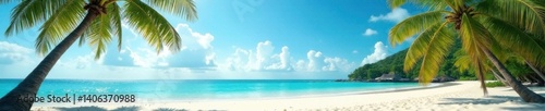 Fototapeta premium Palm trees swaying in gentle ocean breeze amidst vast sandy beach, sandy...