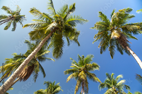 © Thanakorn Thaneevej, Naklejka premium Palm trees with coconut under blue sky