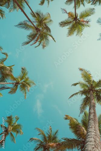 © nevodka.com, Naklejka premium Palm trees with coconuts at clear summer day vintage toned frame with copy space in center