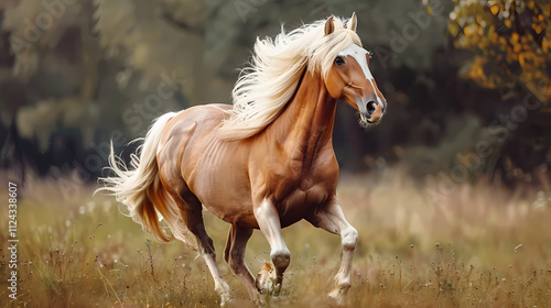 Obraz premium Palomino Horse in Autumn Meadow: A majestic palomino horse with a flowing, golden mane and tail gallops freely across a sun-drenched autumn meadow, embodying power, grace, and untamed beauty.