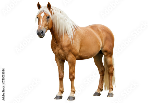 Obraz premium Palomino horse isolated on transparent background, golden coat equine with blonde mane and tail PNG