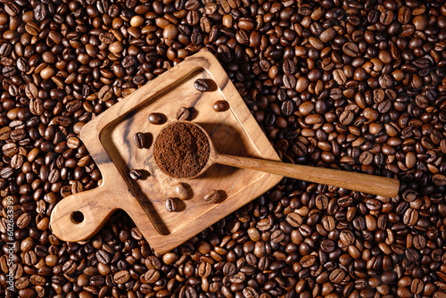Obraz premium Palone ziarna kawy z drewnianym podstawkiem i łyżeczką z mieloną kawą
