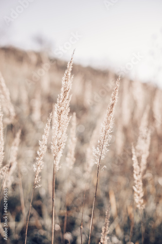 © Lyubov, Fototapeta premium Pampas grass in autumn. Natural background. Dry beige reed. Pastel neutral colors and earth tones. Selective focus.