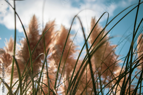 © Hatice, Fototapeta premium Pampas grass plant, close-up. against the sky. yellow spikes.