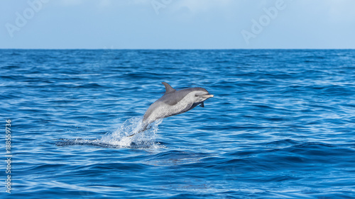 Obraz premium Pan tropikalny delfin plamisty, delfin skoki w błękitne morze