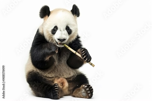 © Auon, Naklejka premium Panda bear sitting eating bamboo soft fur texture high quality lighting on a white background isolated wildlife photography