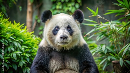 © Praphunsak, Obraz premium panda bear sitting in a zoo enclosure with a calm expression and looking directly at the camera