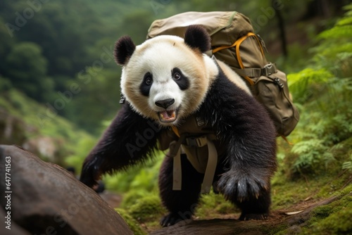 © Ева Поликарпова, Obraz premium Panda Bear with Backpack Walking on Trail