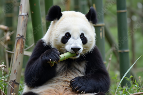 © Dan, Fototapeta premium Panda chewing bamboo in lush forest