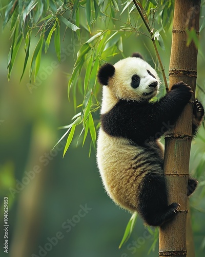 © AssanAI.Studio, Obraz premium Panda Climbing a Tree in Lush Green Forest