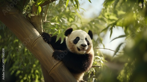 © KOSHKAROV SERGEI, Obraz premium Panda Clinging to a Tree Trunk