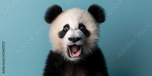 © Qrisio, Naklejka premium Panda close-up. bamboo bear, Animal looking at the camera, turquoise background, space for text, banner for advertising