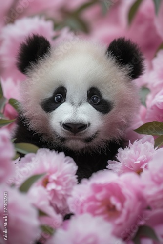 Naklejka premium Panda cub among a bed of soft pink peonies