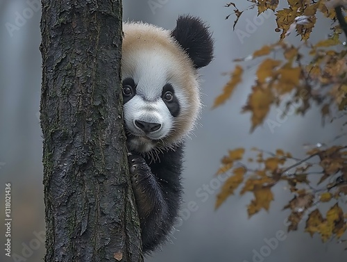 © sepak, Obraz premium Panda Cub Hiding Autumn Forest Tree