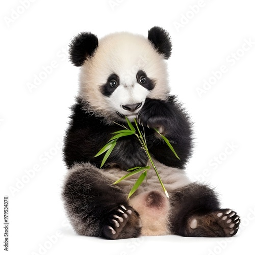 © JHONDOMINIC, Naklejka premium Panda Cub Sitting with a Playful Look, Holding a Small Piece of Bamboo