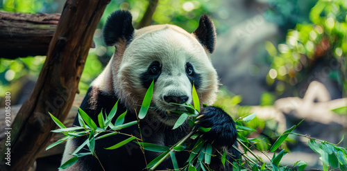 © David, Fototapeta premium Panda eating bamboo in a lush forest setting during the daytime