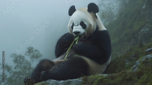 © Raffaza, Obraz premium Panda eating bamboo in fog.
