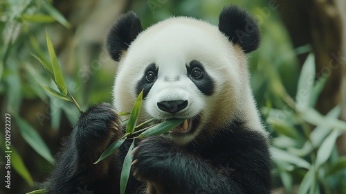 © Design By Reiga, Obraz premium Panda eating bamboo in lush forest (1)