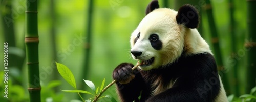 Fototapeta premium Panda eating bamboo, visible enclosure details, fur, leaves, ursidae