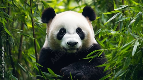 Fototapeta premium Panda eats bamboo shoots. Rare and endangered black and white bear. Image of...