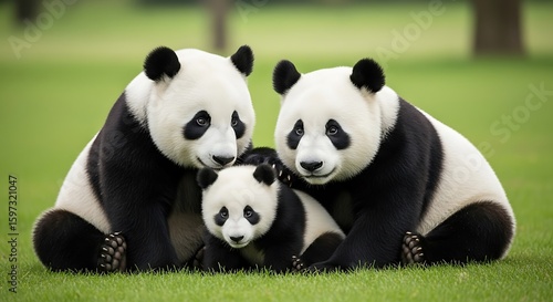 © Abdul, Naklejka premium Panda Family Together on Grass, Black and White Wildlife Portrait