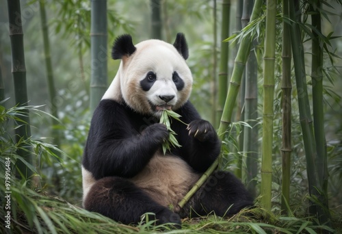© orelphoto, Obraz premium Panda feeding on bamboo in forest