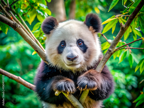 © MD USUB BISWAS, Obraz premium Panda hanging from the branches in tropical forest close up portrait.