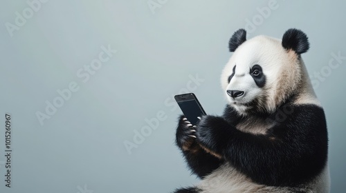 Fototapeta premium panda holding a smartphone, typing with its paws, isolated against a simple...