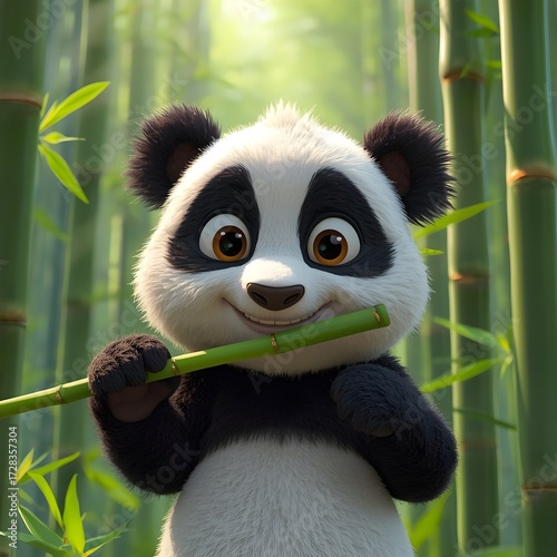 Fototapeta premium Panda in bamboo forest. 3D animation style cute cartoon panda eating bamboo.
