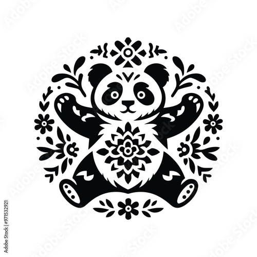 © Cici, Fototapeta premium panda in folk art black and white silhouette illustration