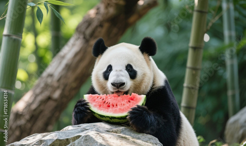 © wodeol99, Fototapeta premium Panda joyfully devours a slice of juicy watermelon