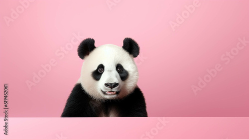 Naklejka premium Panda Looking at the Camera. Solid color background with empty space for text. Web Banner template. Generative AI