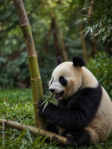 © claudunia, Obraz premium Panda munching bamboo in nature.