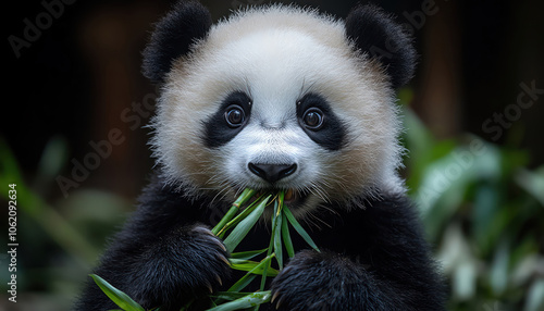Fototapeta premium Panda munching on bamboo, wideeyed and adorable closeup