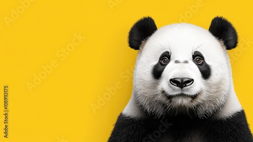 © CreativeBro, Naklejka premium Panda portrait with a sweet expression, set against a vibrant yellow background, perfect for advertising banners and promotional text placement.